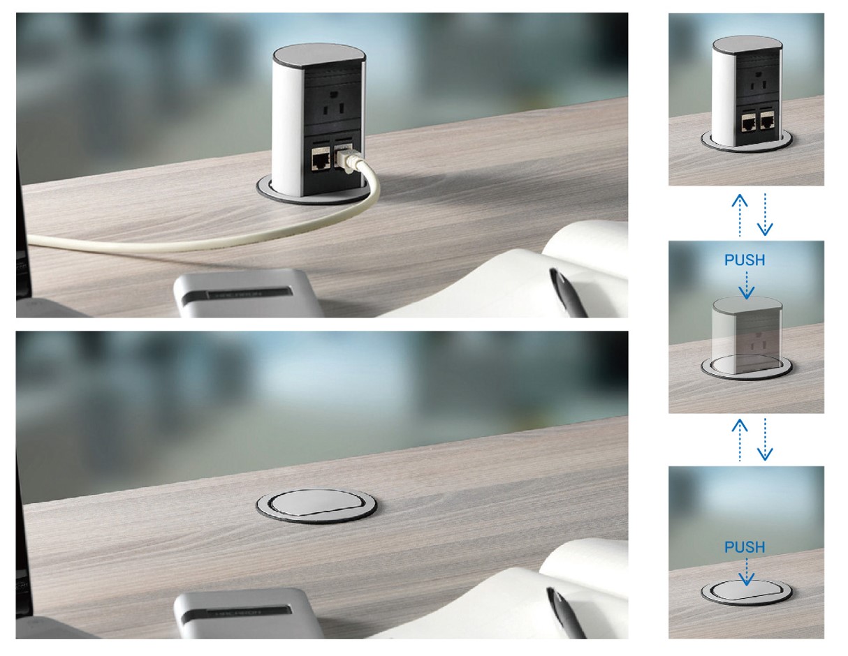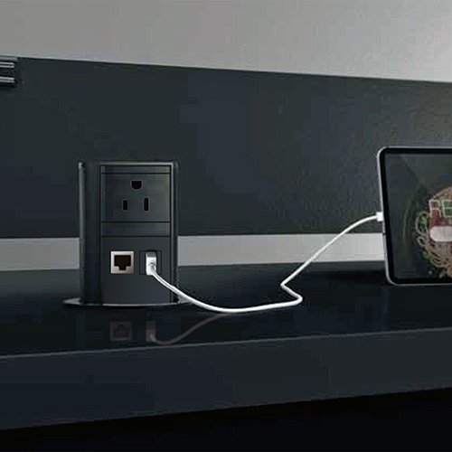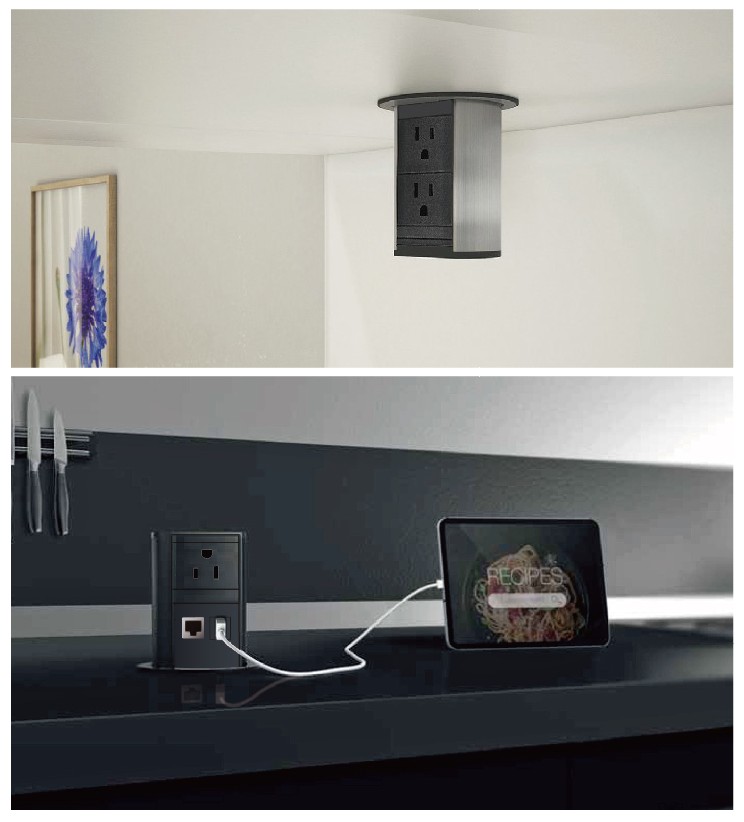 出し入れ自由自在、省スペースで機能的且つオシャレな『エレベーター』は、省スペースで複数の電源や通信モジュールを提供できるコンセントユニットです。