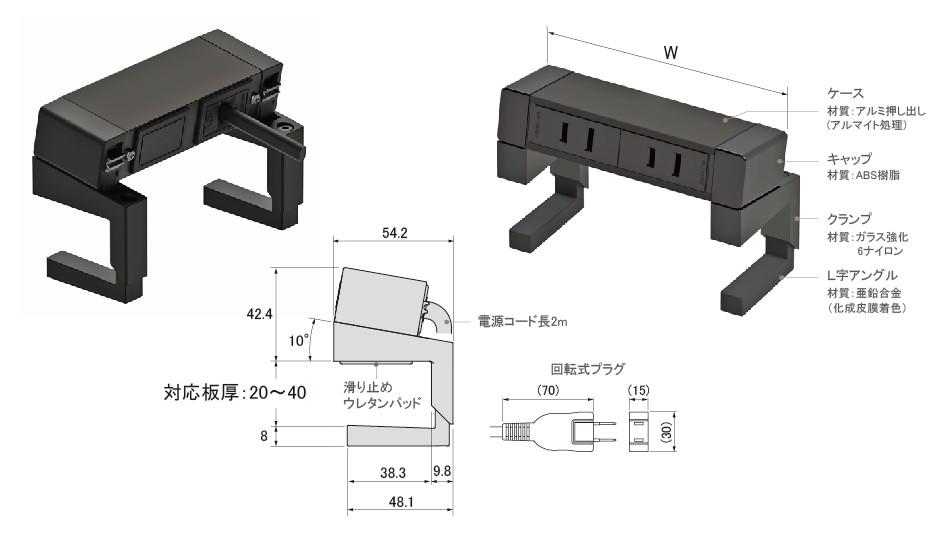 | サイズ | 2口タイプ(クランプ装着時):W207x54.2x70.4~90.4(板厚による) |